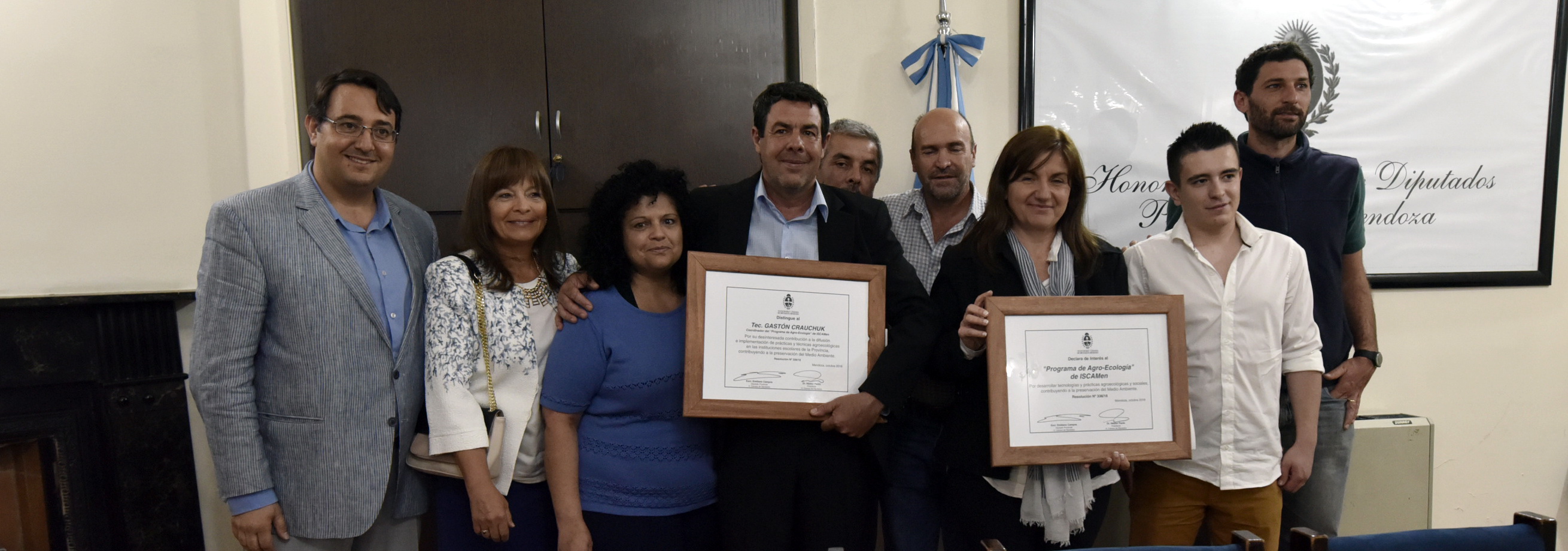 En el Salón Azul se distinguió a los participantes del Programa Agro-Ecología del ISCAMEN que tiene por objeto desarrollar tecnologías y prácticas agroecológicas y sociales, para transferirlas a los productores de la Provincia, contribuyendo a la preservación del medio ambiente (acuaponia, control biológico de plagas, entre otras). La iniciativa fue promovida por el diputado Emiliano Campos (UCR), y participó del encuentro la vicegobernadora, Laura Montero.